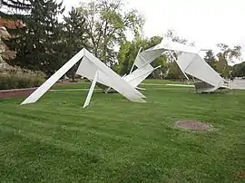 The abstract aluminum plate sculpture, which measures approximately 25 feet (7.6 m) x 65 feet (20 m), was commissioned in December 1980 and dedicated on July 9, 1982. It cost $30,000–35,000, and Allied Fabricating and Welding Company served as the fabricator.[1] The sculpture was originally installed near Mershon Auditorium, but was relocated on June 5, 1985, to the southeast corner of College Rd. and W. 18th Ave. because of construction of the Wexner Center for the Arts. The Smithsonian Institution describes the work as "a white twisting metal sculpture symbolizing the ocean's waves breaking on the shore".[1] It was surveyed by Smithsonian's "Save Outdoor Sculpture!" program in 1993.[1]