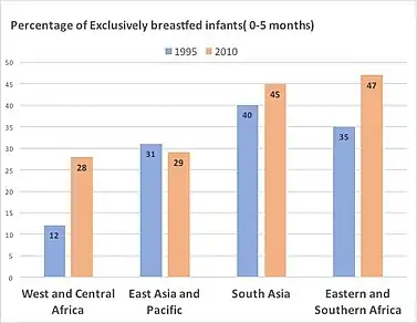 WHO infant feeding recommendation states infants should be breastfed exclusively for the first six months of life to achieve optimal growth, development and health.[62] Exclusive breastfeeding (EBF) refers to the practice of feeding an infant on breastmilk alone for the first six months of life, without supplementing it with other food or even water.[63][64] According to WHO and UNICEF, mothers should initiate breastfeeding within the first hour after birth. Thereafter, exclusive breastfeeding should be continued for at least the first six months of life before the introduction of supplementary feeding.[65] Exclusively breastfed infants can only take oral rehydration solution, vitamins and minerals, and prescribed medications.[65] Scientific studies carried out by WHO and UNICEF have shown that both the mother and the child benefit from breastfeeding.[66] Breastfeeding is a cost-effective intervention that reduces the infant mortality and morbidity by lowering the risk of sickness from acute and chronic infections.[65] Prevalence of EBF increased in almost all regions in the developing world, from 1995 to 2010.[67] The biggest improvement can be seen in the West and Central Africa where the prevalence of EBF is more than doubled from 12% in 1995 to 28% in 2010. Southern and Eastern Africa also shows improvements with an increase from 35% in 1995 to 47% in 2010.[67] However, according to the UNICEF, there are no satisfactory changes in the EBF rates for the first six months since 1990. In order to provide breastfeeding support, WHO and UNICEF have developed two feeding programs, i.e.the 40-hour breastfeeding counseling, and the five-day infant and young child feeding counselling.[68][69] Furthermore, Yılmaz, Elif et al.,[70] in their clinical investigation report states, despite all the recommendations of the WHO, the rates of breastfeeding initiation and duration are still far from expectations worldwide.