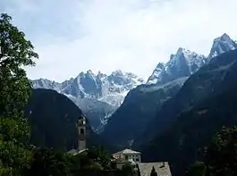 Bregaglia (Italian and Romansh: ⓘ) is a municipality in the Maloja Region in the canton of Grisons in Switzerland. It was formed by the 2010 merger of the municipalities of Bondo, Castasegna, Soglio, Stampa and Vicosoprano, all located in the Val Bregaglia.