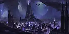 Menzoberranzan is an underground city populated by the drow, and ruled over by the priestesses of Lolth.[50][51] The city has 20,000 drow inhabitants and hundreds of thousands of humanoid slaves such as goblins, kobolds, bugbears, duergar, svirfnebli, orcs, ogres, minotaurs, and giants, as well as herds of rothé kept as livestock. The city trades poisons, mushrooms, riding lizards, spell scrolls, wine, and water.[51] The worship of Lolth is prevalent, and the city has the clerical academy Arach-Tinilith, a spider-shaped building where priestesses are trained. Arach-Tinilith is one of the three branches of the city's Academy in the Tier Breche section of the city. Arach-Tinilith is neighbored by the warrior school Melee-Magthere, and Sorcere tower where arcane spellcasters are sent to study. These academies are the quarters of some of the most powerful clerics, fighters and wizards, respectively, and the title of master of an academy is coveted, since being the master of Sorcere or Melee-Magthere is as high as the power ladder goes for some houseless drow or even noble males.[51][52]
