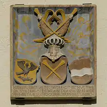 The blazon of the municipal coat of arms is Per fess pally of six Argent and Sable and barry of six of the same.[9]
