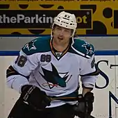 During the 2011 NHL Entry Draft, Burns, along with a second-round draft pick in 2012, was traded to the San Jose Sharks in exchange for Devin Setoguchi, Charlie Coyle and a first-round pick in 2011.[12] With a year still left in his contract with the Wild, Burns signed a five-year contract extension on August 1, 2011, with the Sharks; the deal would pay him $28.8 million over five years, with an average salary cap figure of $5.76 million.[13] In 2013, after rookie defenceman Matt Irwin's acquisition by the Sharks, in March, Burns was moved to forward, where he scored 20 points in 23 regular season games.[14] In the 2013–14 season, Burns played the first eight games of the season, but missed 13 games after October 21 due to sore gums.[15][16] On November 21, Burns returned to the Sharks' line-up and scored a goal against the Tampa Bay Lightning in a 5–1 winning effort. On November 29, against the St. Louis Blues, Burns recorded his first career hat-trick in a 6–3 victory.[17]