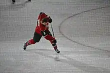 Upon turning professional with the Wild in 2003, Burns was converted to defence by defensively-minded Minnesota Head Coach Jacques Lemaire. He made his NHL debut with the Wild on October 8, 2003, against the Chicago Blackhawks, and scored his first NHL goal in his third game, against the Sharks.[4] Burns played in 36 games with Minnesota in the 2003–04 season, showing flashes of natural ability in rushing from the blueline.[5] After spending the 2004–05 NHL lock-out in the American Hockey League (AHL) with the Houston Aeros, Burns adapted as a defenceman and earned a regular spot on the Wild roster for the 2005–06 season, contributing 16 points in 72 games.