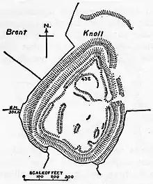 Brent Knoll has seen human settlement since at least the Bronze Age, becoming an Iron Age Fort about 2,000 BC,[3] which covers an area of 1.6 hectares (16,000 m2). It is defended by a single wall around 10 metres (33 ft) high and by a single ditch, with an entrance on the eastern side,[8] with a second bank on the north east side.[2] It is surrounded by multiple ramparts (multivallate) following the contours of the hill, however these have been heavily damaged by cattle and quarrying.[8]