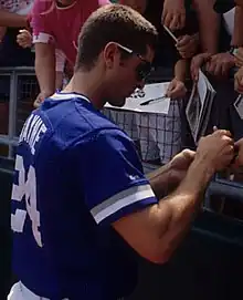 Mayne was an All-American at Cal State Fullerton, and inducted into the Orange Coast College Hall of Fame in 2006. He was drafted in the first round of the 1989 Major League Baseball (MLB) Draft, 13th overall.[1] Brent Mayne was a major league catcher from 1990 to 2004. He played most of his career with the Kansas City Royals but also spent time with the Mets, A's, Giants, Rockies, Diamondbacks, and Dodgers. He ranks 75th in the history of baseball with 1,143 pro games caught, and held the distinction of being the only catcher in the twentieth century to have won a game as a pitcher, until Cubs backup catcher John Baker won a game as a relief pitcher on July 29, 2014.[2] Through his career, the well traveled Mayne was an effective catcher and an excellent handler of pitchers. He blocked the plate well and had a strong arm. Mayne was a decent hitter with occasional power and compiled a career high .301 batting average in consecutive seasons (1999–2000). In retirement, Mayne has gone on to serve on the board of directors of the Braille Institute[3] and the Center for Hope and Healing. He is also the author of a book titled "The Art of Catching" and creator of a website and blog www.brentmayne.com.
