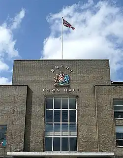In September 1943, during the Second World War, a ceremony was held at the town hall, attended by the former Prime Minister of Canada, Viscount Bennett, to commemorate the borough's fund raising achievements during Wings for Victory Week.[7] In 1951, Pevsner described the town hall as "the best of the modern town halls around London, neither fanciful nor drab".[8] It has also been described as "an English interpretation of Modernism", using brick rather than concrete.[9]