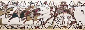 ![]() "Here the knights of Duke William fight against the men of Dinan; and Conan passed out the keys". Two successive scenes from the contemporary Bayeux Tapestry (c.1066) depicting the Battle of Dinan, one of the decisive battles of the war. | |||||||