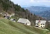 Breznica pod Lubnikom is a village with a clustered core on the south slope of Mount Lubnik (1,025 meters or 3,363 feet).[2] It also included the hamlets and isolated farms of Dolinček, Potočnik, Pri Nacetu, Rohotnik, Zalubnikar, and Žerinc. The Breznica Gorge (Brezniška grapa) lies to the east, the Potočnik Gorge (Potočniška grapa) to the northwest below Pleše Hill (941 meters or 3,087 feet), and the Sopotnik Gorge (Sopotniška grapa) to the west below Hoje Hill (821 meters or 2,694 feet).[2] The village is connected by road to Podpulfrca in the Poljane Sora Valley to the southeast.