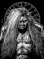 Bolland's covers adorn the whole second and third volumes of Grant Morrison's The Invisibles[84] and his depictions of the main characters are widely reprinted as the definitive images, despite them all having been realised by other artists – and often drawn by several before Bolland entered the picture. With this title, the artist remarks the complicated subject matter necessitated his "working a lot of strange symbolism and subliminal messages into the cover designs" to create "an image that puzzles to a degree and is layered with elements of surrealism."[78] Asked to take over from Sean Hughes on the covers for volume two by editor Shelly Roeberg, Bolland found her to be an ideal editor, effusive with praise and specific in requirements. Generally, Bolland recalls she was excited for his ideas, although Morrison had approval on all designs as the series creator. Finding that he had a rapport with, and the trust of, his editor, Bolland thinks that these factors led to some of his most experimental work.[86] Newly embracing the use of a computer, Bolland cites The Invisibles Vol 2 No. 11 as his earliest computer-assisted piece of artwork.[87]