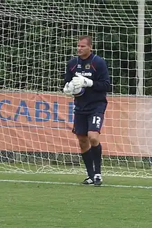 While waiting for his Alkmaar contract to run out, Jensen trained with Division One side West Bromwich Albion, where his imposing stature earned him the nickname "The Beast".[3] When West Brom keeper Chris Adamson was asked to comment on Jensen, he told reporters he was "nothing but a beast".[5] Jensen moved to West Brom for a fee of £80,000 in March 2000.[2] He made his Albion debut on 7 March 2000 and kept a clean sheet in a 2–0 victory over Tranmere Rovers. He stayed at West Brom for three years, playing a total of 50 games. He helped the club survive in Division One in 1999–2000, and was a regular for much of the following season, until the arrival of Russell Hoult saw the end of Jensen's playing time for WBA in February 2001.[6] Jensen never re-gained a regular place, playing only one match in Albion's promotion season of 2001–02.[7] He moved on in 2003, after West Brom were relegated, finishing 19th in the Premier League.