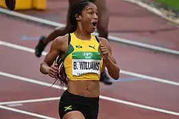 Williams improved her official Jamaican under-20 record of 11.02 seconds in the women's 100 metres at the JAC Summer Open in Jacksonville, Florida on 30 May, clocking 11.19 seconds in the prelims and then winning the final in 11.01 seconds.[24] A day later in the American Track League at the same track she ran 10.97 in the prelims, but the time was assisted by a +2.5 m/s wind, making it ineligible for record purposes which allow no more than a +2.0 m/s wind velocity. In the final she clocked 10.98 seconds to win with only a +1.0 m/s wind, setting her second Jamaican under-20 record in two days.[25] In June 2021, Williams placed fourth at the Jamaican National Championships with a time of 11.01 in the 100 metres, thus not qualifying for the 2020 Summer Olympics in that event.[23] However, she competed at the Olympics as a part of the 4 x 100 metres relay team, winning the gold medal.