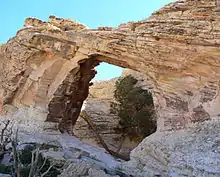 The hike climbs over the crest of the shale formed, north-south oriented Spring Mountain Ranges, and rewards the hiker with panoramic views of the Red Rock Escarpment below. A marked trail along the crest descends to the sandstone escarpment. Here, steep free climbing down a chimney—possible without technical gear—takes the hiker to a narrow neck of rock that separates the drainages of Pine Creek to the south and Icebox Canyon to the north. The hike is marked by cairns that show the route to proceed up toward the base of a cliff, angling left just above the northern drop-off. The hike ascends the slickrock here, in a crack in the rock. After about 150 feet (50 m), the route comes to a point where there is a broad, flat ledge on the left, then continues about several feet to the left where a wider gully climbs to the top of the cliff. This leads up to the natural bridge for which the mountain is named. The bridge itself is the remains of a tinaja, or water tank, that eroded and left a remnant of the side, now a bridge.[4]