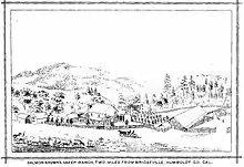 One of the first settlers was Salmon Brown, a Merino sheep farmer, son of John Brown the abolitionist. To rescue his mother Mary from hostility to Brown in Red Bluff, in 1870 he sold his ranch near Corning, California, and bought one near Bridgeville. Mary and her daughters moved nearby, to Rohnerville.[3] In 1893 he moved to Portland, Oregon.[4]