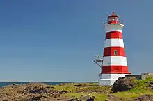 Brier Island is frequently inundated by fog and has witnessed 57 recorded shipwrecks.[4] The island has "a lighthouse per mile" with the Northern and Western lighthouses on the island, as well as the Peter Island lighthouse in Grand Passage; all are automated and are operated by the Canadian Coast Guard. The wreck of the barque "Aurora" in 1908 provided the lumber for the Westport Community Hall.[5]