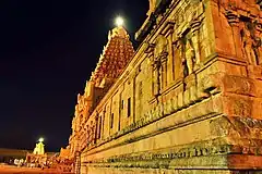 Brihadeeswara Temple, also called Big Temple, is a Hindu temple dedicated to Shiva and built by Raja Raja Chola I in Tamil architecture in 1010 AD, in his capital city Thanjavur.[1] The temple is part of UNESCO World Heritage Site and "Great Living Chola Temples". The vimana (or temple tower) is 216 ft high (66 m) and is among the tallest of its kind in the world. The Kumbam (Kalasha or Chikharam) Vimanam (apexex or the bulbous structure on the top) of the temple is carved out of a single stone and it weighs around 80 tons.[2] It is an architectural exemplar showcasing the pure form of the Dravida type of temple architecture and representative of the Chola Empire ideology and the Tamil civilisation in Southern India. The temple "testify to the brilliant achievements of the Chola in architecture, sculpture, painting and bronze casting."[3]