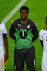 Razak earned the first of his 27 caps for Ghana on 14 August 2013, appearing in a 2–2 friendly draw in Turkey as a 46th-minute substitute.[30] He was part of the squad that appeared in the 2015 Africa Cup of Nations, being first choice as the nation reached the final;[31] in the decisive match, against the Ivory Coast, he missed his penalty shootout attempt in an eventual 9–8 loss.[32]