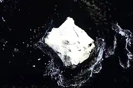 Several small islets occur all around Bristol Island. The largest ones (more than 1 km, 0.62 mi) lie all west of Turmoil Point and consist of Grindle Rock, Wilson Rock and Freezland Rock.[11] These islets and numerous sea stacks formed through coastal erosion.[17] The submarine portion of Bristol Island has an irregular shape, especially in the north and west where it extends to some distance from the coastline.[5] A shallow shelf of less than 180 metres (590 ft) depth surrounds the island especially in the west, where it forms Freezland Bank. Towards the seafloor, Bristol Island widens to a diameter of 90 kilometres (56 mi).[18] Numerous submarine sector collapse scars surround the island especially on its southern side, while a ridge and a secondary seamount[19] and secondary volcanism lie due west and extend 14 kilometres (8.7 mi) from Bristol.[17]