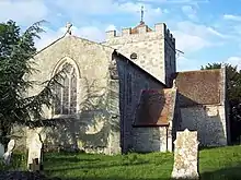 The Church of England parish church of Saint Peter stands near the riverbank, with Rectory Farm alongside, north-west of the present village. The tall nave survives from a substantial Saxon church of the 8th or 9th century,[21] although it has been rebuilt except for the lower parts of the north and south walls.[22]
