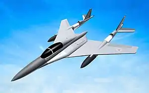 The configuration allowed for two nozzles at the front and a single 90-degree rotating rear exhaust which was more efficient than having to split it into the twin rear nozzles used on the Harrier.[2] The booms provided a low drag location for the carrying of cannons in the front as well as missiles and avionics, while also shielding the jet exhausts from heat seeking missiles.[2] Instead of the Pegasus engine whose design dated back to the 1950s the design used the Rolls-Royce RB.422.48 with PCB fitted only on the front nozzles.[2] The design allowed the engine to be removed without needing to remove the wing as on the Harrier. To reduce weight the airframe was to use lithium-based aluminium alloys, superplastic-formed diffusion-bonded titanium and carbon-fibre composites.[3] The booms had all-moving fins and differential tailplanes.