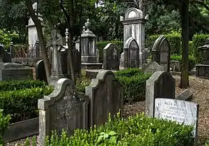 At the time it was established, the Cemetery was well outside the built-up area of the city, being surrounded by farms and vineyards. A wall was built around it, with an entrance to the west. Trees, mainly cypress, were planted, as the Inquisition wanted to "hide the graves of the heretics from the eyes of the faithful", and the plot became known as the "Cemetery of the Cypresses". The path from the entrance to St George's Church to the northwest of the plot was also bordered by cypresses. Many were blown down by a cyclone in 1941 but some of the original trees remain. Although now surrounded by roads and buildings, the Cemetery remains well wooded, but insufficiently wooded for residents of surrounding apartments who reportedly complained about the view in 2022.[5] The original British lease document was lost in the 1755 Lisbon earthquake but the first Dutch lease survives. The Cemetery, itself, was largely undamaged by the earthquake, although there is evidence of the ground levels being raised in places. According to available records, 68 British people were killed by the quake, although there is no reference to the event in Church records or on any tombstones.[1][4][6]
