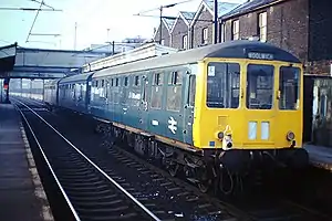 ![]() Class 104 formed from vehicles M50564, M59182, M50594 at Tottenham Hale in March 1976 | |