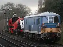 Eurostar owned and formerly operated two Class 73 locomotives, which were specially modified to enable them to haul a Eurostar unit. The two locomotives; 73118 and 73130, have additional coupling equipment fitted and were primarily used to rescue failed Eurostar sets, or to haul them over non-electrified routes. They were rarely used away from North Pole depot. When Eurostar moved its operations to the new Temple Mills depot and onto the overhead wiring of High Speed 1 in 2007, the Class 73 locomotives became redundant and were loaned to educational initiatives: 73130 went to RailSchool in East London and 73118 went to Barry Rail Centre in South Wales. Subsequently, when RailSchool failed, 73130 was loaned to the Bluebell Railway but is stored away from the railway. As of 5 November 2022 73130 is now in the hands of the 73130 Ltd based at the Llanelli and Mynydd Mawr Railway in Carmarthenshire.[9]