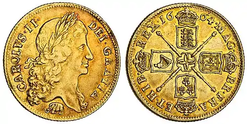 The Two guinea coin was produced in 1664, 1665 (possibly only 1 coin), 1669, 1673, and 1675-1684 inclusive; until 1669 the weight limits were 16.6-16.8 grams, afterward 16.5-16.7 grams. The obverse and reverse of this coin were designed by John Roettiers. The obverse showed a fine right-facing bust of the king wearing a laurel wreath, surrounded by the legend CAROLVS II DEI GRATIA, while the reverse showed four crowned cruciform shields bearing the arms of England, Scotland, France, and Ireland, between which were four sceptres, and in the centre were four interlinked "C"s, surrounded by the inscription MAG BR FRA ET HIB REX [date]. The coin was considered too thin to have an edge inscription like the larger contemporary Five Guineas coin, but still required a milled edge to deter counterfeiters from simply gilding contemporary silver Halfcrown coins as well as clipping or filing down of the coin's weight. Until 1668, the milling was perpendicular to the coin, visibly providing vertical grooving, however from 1669 onwards, the milling was obliquely grained.