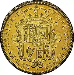 George II's reign is also marked by the introduction of pattern or proof issues of the Two Guinea, struck from carefully prepared and highly polished dies. An example of John Croker's pattern of the Two Guinea of 1733, struck in advance of the first currency issue of the reign recently sold for £38,000 at auction in London.[1]
