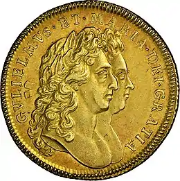 With the removal of James II in the Glorious Revolution of 1688, his daughter Mary, and her husband Prince William of Orange ruled jointly by agreement as co-monarchs. Their heads appear conjoined on the two guinea piece in Roman style, with William's head uppermost, with the legend GVLIELMVS ET MARIA DEI GRATIA. In a departure from the previous reigns the reverse featured a totally new design of a large crowned shield which bore the arms of France in the first quarter, of Scotland in the second quarter, of Ireland in the third quarter, and of England in the fourth quarter, the whole ensemble having a small shield in the centre bearing the rampant lion of Nassau; the legend on the obverse read MAG BR FR ET HIB REX ET REGINA date. The weight tolerance of the coin in this reign was 16.7-16.8 grams. The two guinea coin of this reign was probably the work of James and/or Norbert Roettier and, apart from a rare issue in 1691, it was only produced in 1693 and 1694.