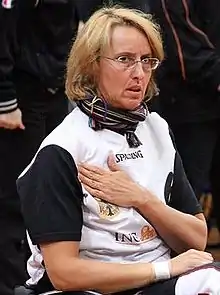 In June 2012 she was named as one of the team that competed at the 2012 Summer Paralympic Games in London.[8] At the age of 49, she was the oldest wheelchair basketball player there.[4][9] In the Gold Medal match, the team faced the Australia women's national wheelchair basketball team,[10] a team that had beaten them 48–46 in Sydney just a few months before.[11] They defeated the Australians 44–58 in front of a crowd of over 12,000 at the North Greenwich Arena to win the gold medal,[10] the first that Germany had won in women's wheelchair basketball in 28 years.[12] They were awarded a Silver Laurel Leaf by president Joachim Gauck in November 2012,[13] and were again named Team of the Year for 2012.[12] For Dillmann, the gold medal victory removed the pain of the loss 24 years before.[4] "Das hat mich versöhnt mit Seoul" ("This has reconciled me with Seoul") she said.[4]