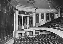 On either side of the stage is a wall section with three boxes at the balcony level. The boxes step downward toward the stage; the front box curves forward into the proscenium arch, while the rear box curves backward into the balcony.[9][22] At the orchestra level, there are three rectangular openings, corresponding to the locations of former boxes on that level. The front railings of the boxes contain sections of a Panathenaic frieze, separated by fasces made of plaster;[25] the frieze contained depictions of horsemen.[9] The underside of each box is decorated with a medallion containing a light fixture; this is surrounded by a molded band.[25] Doric-style columns separate the boxes from each other, supporting a molding and panel at the top of each wall section.[9][25]