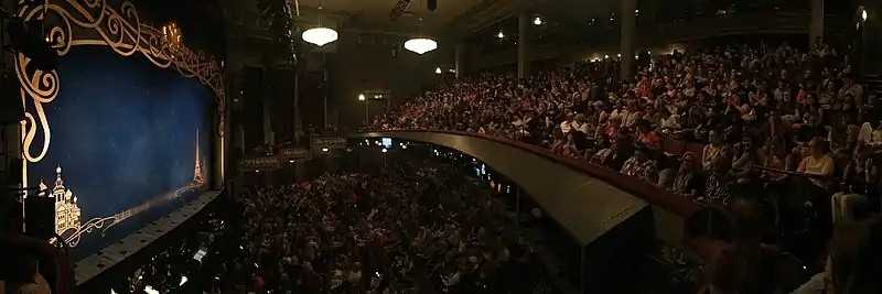 The auditorium has an orchestra level, one balcony, boxes, and a stage behind the proscenium arch. The auditorium has about the same width and depth, and the space is designed with plaster decorations in relief.[22] According to the Shubert Organization, the theater has 1,218 seats;[18] meanwhile, The Broadway League gives a figure of 1,186 seats[23] and Playbill cites 1,163 seats.[19] The physical seats are divided into 733 seats in the orchestra, 429 on the balcony, and 24 in the boxes. There are 32 standing-only spots.[18] The theater contains restrooms in the basement and concessions in the lobby.[19] The orchestra level is wheelchair-accessible and contains an accessible restroom; the balcony is not wheelchair-accessible.[18]