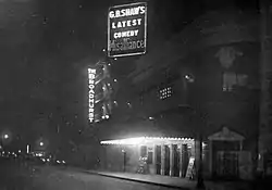 The Broadhurst opened on September 27, 1917, with George Bernard Shaw's comedy Misalliance;[41][42] the show lasted 52 performances.[43][44] Despite his early intentions, George Broadhurst did not only stage his own shows at the theater;[45] for example, the Broadhurst hosted a revival of R. C. Carton's Lord and Lady Algy in December 1917.[46][47] This was followed in 1918 by the musical Maytime with Peggy Wood[45][48][49] and the play Ladies First with Nora Bayes and William Kent.[41][50] Rachel Crothers's comedy 39 East opened at the Broadhurst in 1919,[41][51][52] and Jane Cowl and Allan Langdon Martin's collaboration Smilin' Through at the end of that year.[53][54][55]