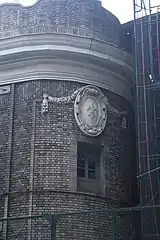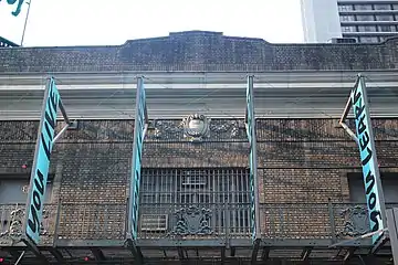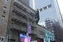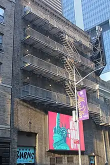 Along 44th Street, the auditorium's second and third floors contain a fire escape made of cast iron and wrought iron. There are doors and windows on both levels, leading to the fire escape. In addition, the fire escape's third-floor railing contains cast-iron depictions of ribands and shields.[20][21] A canopy originally shielded the fire escape at the third floor.[21] Above the center of the third floor, on 44th Street, is a terracotta cartouche containing depictions of swags. The curved corner contains a third-floor window, topped by an oval escutcheon decorated with swags and fleur-de-lis. A terracotta cornice and a brick parapet runs above the auditorium facade.[20][21] The parapet is stepped and contains a coping made of sheet metal.[20]