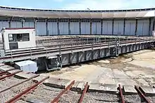 Dating from 1924, turntable # 1 is located almost directly west of turntable # 2. It is an electric turntable, still functioning. The turntable was raised when the roundhouse was demolished in the 1990.[3] The electrical drive equipment was removed after the depot was closed, but a replacement drive cabin & motor (currently non operational) was fitted to the turntable in 2016.