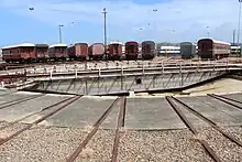 In July 1926, construction of the manually operated 23 m (75 ft) diameter No. 2 turntable at its associated 42 radial roads was completed.[1] Unlike the roads surrounding No. 1 turntable, initially none of the radial roads on No. 2 turntable were covered. Over the following years, several plans were proposed for the construction of a roundhouse building on the radial roads surrounding No. 2 turntable. A plan dated 30 January 1922 for a proposed Car and Wagon Works on land adjoining the loco depot site even shows a proposed third turntable, with all 3 turntables having full roundhouses.[12]