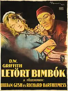 Broken Blossoms or The Yellow Man and the Girl, often referred to simply as Broken Blossoms, is a 1919 American silent drama film directed by D. W. Griffith. It was distributed by United Artists and premiered on May 13, 1919. It stars Lillian Gish, Richard Barthelmess, and Donald Crisp, and tells the story of young girl, Lucy Burrows, who is abused by her alcoholic prizefighting father, Battling Burrows, and meets Cheng Huan, a kind-hearted Chinese man who falls in love with her. It was the first film distributed by United Artists. It is based on Thomas Burke's short story "The Chink and the Child" from the 1916 collection Limehouse Nights. In 1996, Broken Blossoms was included in the annual selection of 25 motion pictures to be added to the National Film Registry of the Library of Congress.[3]