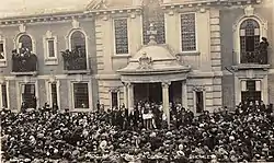 The foundation stone for the new building was laid by a former charter mayor, Thomas Dewey, on 25 July 1906.[5] The new building was designed by R. Frank Atkinson in the Baroque style and built by F. G. Minter of Putney.[6] It was officially opened by the mayor, Alderman Reginald James, on 25 September 1907.[7] The design involved a symmetrical main frontage with 15 bays facing onto Tweedy Road; the central section of three bays featured a semi-circular porch supported by four Ionic order columns and surmounted by an urn on the ground floor; there were three windows with a pediment above on the first floor; a wooden cupola with a copper dome was erected at roof level.[1] The principal rooms were the council chamber and the mayor's parlour, both located on the first floor.[4]