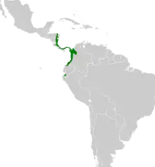 Subspecies C. u. melanorrhoa of the bronze-tailed plumeleteer is the northernmost. It is found from eastern Nicaragua into Costa Rica and has a few records in eastern Honduras. C. u. isaurae is found on the Caribbean slope and locally on the Pacific slope of Panama and into extreme northwestern Colombia. The nominate is found from eastern Panama's Darién Province through north-central and western Colombia into northwestern Ecuador. The species inhabits the interior and edges of humid forest, mature secondary forest, and semi-open landscapes such as banana plantations and gardens. It shuns open areas. In elevation, it ranges from sea level to 700 m (2,300 ft) in Costa Rica and up to 900 m (3,000 ft) in Colombia.[8][9]