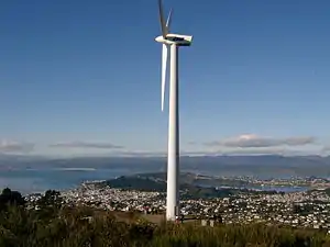 The original turbine was decommissioned in 2015 due to age, and replaced in 2016 with a larger version. The original turbine, a Vestas Wind Systems A/S turbine, was a relatively small machine compared with other turbines now installed in New Zealand, such as those at Te Āpiti Wind Farm, with an installed capacity of 225 kW. The present turbine, a German Enercon E-44, has a capacity of 900 kW, enough to power around 490 homes,[45] with the power generated going into the local network for general distribution. The tower hub is 44m high and the blades are 20.8m long.