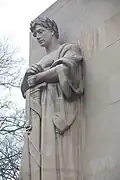 Inspired by Parks Commissioner Robert Moses’s desire to provide a World War II monument to each borough, this monument was created. It is a granite and limestone 24-foot-tall (7.3 m) memorial designed by Stuart Constable, Gilmore D. Clarke, and W. Earle Andrews, who worked in concert with the architectural firm of Eggers and Higgins.[1] The two larger-than-life sized high relief figures by sculptor Charles Keck (1875–1951) are located on the south facade, at opposite ends of the building. It honors Brooklynites who served in World War II. The full plan, however, was never fully built because of lack of funding.[1]