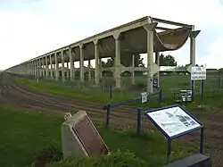 The Brooks Aqueduct is a defunct aqueduct, historic site and museum originally built by the irrigation division of the Canadian Pacific Railway Company during the early 1910s located in Southern Alberta, Canada. The aqueduct was intended to irrigate a section of southeastern Alberta by diverting water east from Lake Newell from 1914 to 1979, and is located approximately 8 kilometres south of the City of Brooks. The main section of the aqueduct spans a 3.2 km valley at an average elevation of 20 metres. The structure has been designated a National Historic Site with an interpretive centre constructed nearby for tourists.[1]