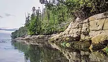 The park contains many different examples of flora and fauna endemic across much of the Pacific Northwest. Examples of the marine life that inhabit the waters of the park include cutthroat trout and salmon varieties such as pink, chinook, or coho.[2][3] Likewise, the park is home to many examples of marine mammals including harbor seals, sea lions, porpoises, dolphins and a variety of whale species.[1] Additionally, the islands are home to both clam gardens that are dotted around intertidal areas[4] as well as a historically sporadic community of pacific white-sided dolphins.[4][5]