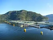 In the archipelago lie several salmon farms.[20] The first salmon farm was introduced into Broughton Archipelago in 1987 and production steadily rose to 17 Gg (gigagrams) by 1999.[21][22] However, due to the nature of open-net pen salmon aquaculture, the tight space became a breeding ground for sea lice.