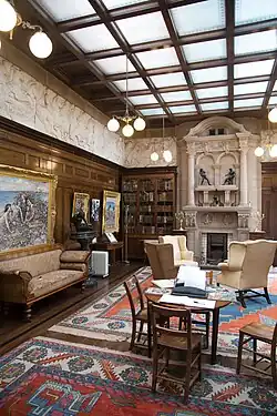 The National Trust for Scotland maintain the house and its contents as a museum of Hornel's life and work. Within the house is a range of period furniture as well as artworks by Hornel and his contemporaries. The house also contains a large reference library of some 15,000 books collected by Hornel,[3] including a 2,500-volume collection of works by or about Robert Burns, one of the largest such collections in the world.[1] The library also holds Hornel's personal archive of newspaper clippings, letters, and other material. The studio is maintained as it would have looked when the artist was at work.[7] In the gallery is a frieze designed to imitate the Elgin Marbles from the Parthenon.[2]