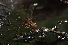 The brown hawker (Aeshna grandis) is a large dragonfly about 73 millimetres (2.9 in) long. It is a distinctive species and is easily recognised, even in flight, by its brown body and bronze wings. At rest, blue spots on the second and third segments of the male's abdomen can be noticed; these are absent in female.