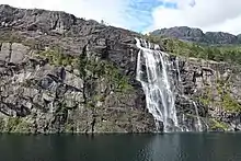 Brudesløret is a waterfall in Haukå which is located in Kinn Municipality in Vestland county, Norway. It is located near Norwegian county road 614, just north of the Norddalsfjorden. The waterfall is about 110 metres (360 ft) high and about 15 metres (49 ft) wide. It is a single-drop horsetail waterfall.[1][2]