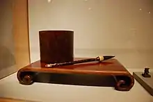 A brush pot (traditional Chinese: 筆筒; simplified Chinese: 笔筒; pinyin: bǐtǒng) is a container for holding the brushes used by scribes for Chinese calligraphy.[1] These are typically carved from bamboo or jade with ornate motifs symbolising concepts such as longevity. Antique examples are now valued highly.[2]