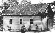 The picture reproduced above right is a drawing of the Meeting House when it served as a post office following several years as a blacksmith shop. This becomes evident by observing in the picture the letter slot in the door (i.e. post office) and the well worn chimney top (i.e. blacksmith furnace heat) remembering that this Meeting House, on its original location, had no means of heating. Subsequent paintings of the structure apparently used this drawing as an example, placing the slot in the door, worn chimney at roof ridge and showing the drooping clapboard siding on the front.