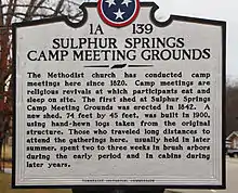Methodists and Baptists widely use brush arbour revivals to communicate the Christian proclamation of salvation, which have historically contributed to the growth of these denominations.[2] For Methodists, this salvation message includes preaching the doctrines of the New Birth and Entire Sanctification, as well as calling backsliders to repentance.[3][4] They originated in the 1700s, being regularly assembled when itinerant preachers announced in advance that they would be arriving in an area; their design served to protect seekers from precipitation.[1] Though brush arbour revivals continue in the present-day, they are the forerunner of the Methodist campmeetings.[5] Their success has historically led to the planting of local churches, as was the case with Morris Chapel United Methodist Church in Walkertown and Swift Creek Methodist Church in Macon.[6][7][8][9] Many of the first Sunday Schools ran by Methodists were held under brush arbours.[10]
